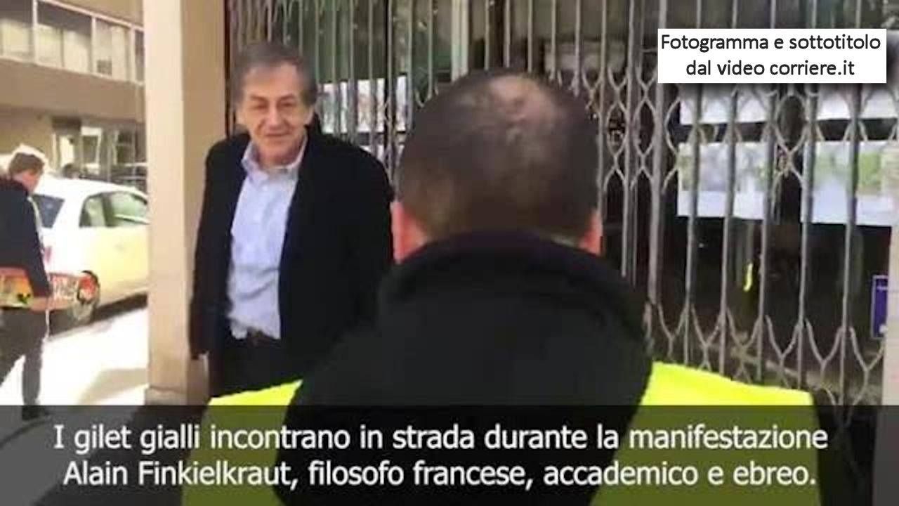 A reti unificate l’”aggressione antisemita effettuata dai Gilets Jaunes” contro Alain Finkielkraut, “attestata” dalle urla (“sporco ebreo", "sporco sionista", "la Francia è dei francesi", "Palestina", "il popolo ti punirà") rivolte da un tizio con la giacchetta gialla - subito immortalato dalle numerose telecamere miracolosamente lì presenti – che non si sa chi sia, né chi rappresenti. Eppure il filosofo Alain Finkielkraut (già insignito tra gli "immortali" dell'Acadèmie Francais) di aggressioni (“fascista”, “oscurantista”, “populista”, “xenofobo”, “razzista”, “omofobo”) condite, in qualche caso, da sputi in faccia ne aveva già subito parecchie in passato, senza conquistarsi la prima pagina dei media mainstream.