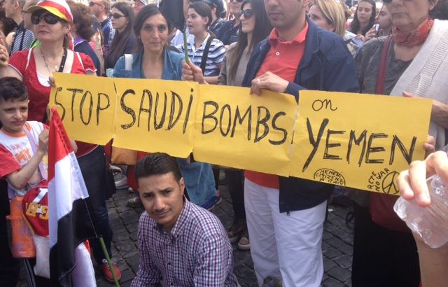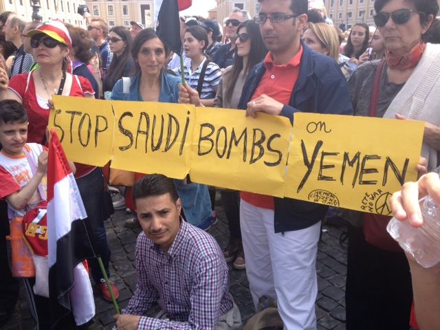 Il 19 aprile 2015, a piazza San Pietro, cittadini yemeniti, di altri paesi arabi e italiani, in rappresentanza della Comunità yemenita, di Rete No War e di Assadaka hanno partecipato all’Angelus del Pontefice portando la bandiera nazionale a strisce rosso-nere-bianche e la scritta “Stop alle bombe saudite in Yemen” su un cartello improvvisato. Gli attivisti avrebbero voluto esibire un grande striscione per ottenere qualche parola dal papa, e visibilità presso i media per un’aggressione – quella saudita – che non suscita lo sdegno mondiale come dovrebbe. Ma i materiali per il muto appello al papa e al mondo sono stati requisiti dalla polizia italiana prima dell’ingresso in piazza.
