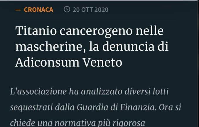 Adiconsum denuncia che alcuni modelli di mascherine chirurgiche potrebbero contenere altissime concentrazioni di biossido di titanio, una sostanza cancerogena e bandita in alcuni paesi (ad es. in Francia). Una vicenda da seguire con estremo interesse.