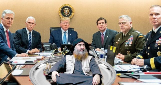 Abu Bakr al Baghdadi, il leader dell’ISIS, dopo essersi rifugiato in lacrime in un tunnel senza uscita, si è fatto saltare in aria con i suoi tre figli; morte anche le sue due mogli, bardate anch’esse con giubbotti esplosivi, rimasti comunque inesplosi. Lo afferma in una conferenza stampa Donald Trump, che avrebbe seguito in diretta l’operazione militare dalla Situation Room della Casa Bianca. Lo riportano in evidenza tutti i media mainstream (a cominciare da Repubblica e Corriere, Il Fatto Quotidiano) che, ovviamente, non si pongono ovvie domande.