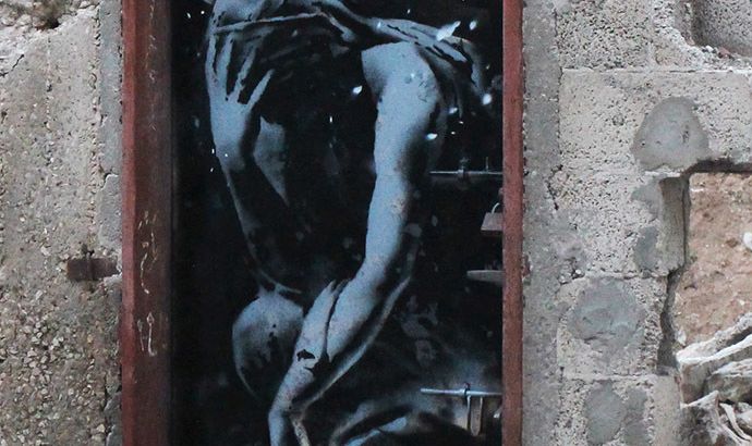 Il primo graffito, dal titolo "Bomb Damage" sembra essere ispirato alla famosa scultura di Rodin "Il Pensatore". Nella versione di Banksy, però, chi guarda è consapevole che l'unica cosa presente nella mente del soggetto è la totale disperazione e devastazione che lo circondano.