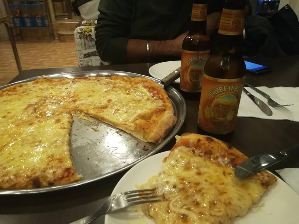Ordiniamo una margherita gigante da mangiare insieme e due birre Taybeh, la birra locale più buona e ormai famosa.