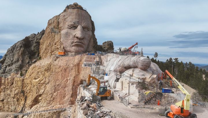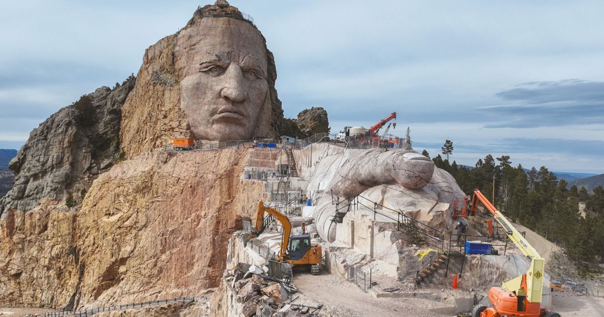 Il Crazy Horse Memorial è una gigantesca scultura montana in corso d’opera dal 1948 nelle Black Hills del South Dakota, non lontano da Mount Rushmore. È stata pensata per rappresentare l’Oglala Lakota Crazy Horse a cavallo, con il braccio teso a indicare le terre ancestrali del suo popolo. L’idea nasce alla fine degli anni ’30 per iniziativa del capo Henry Standing Bear (Mato Naji), che chiede allo scultore di origine polacca Korczak Ziolkowski di realizzare un monumento “per mostrare all’uomo bianco che anche l’uomo rosso ha grandi eroi”. La prima dinamite esplode nel 1948. Da allora sono passati oltre 75 anni: oggi è completata la testa di Crazy Horse (circa 25 metri, più grande di quelle di Mount Rushmore, alte 18 metri), il foro che rappresenterà lo spazio tra il braccio e il cavallo, e solo in tempi recentissimi si è arrivati a definire la mano e parti del braccio. Non esiste una data ufficiale di completamento: il progetto è dichiaratamente “intergenerazionale”.