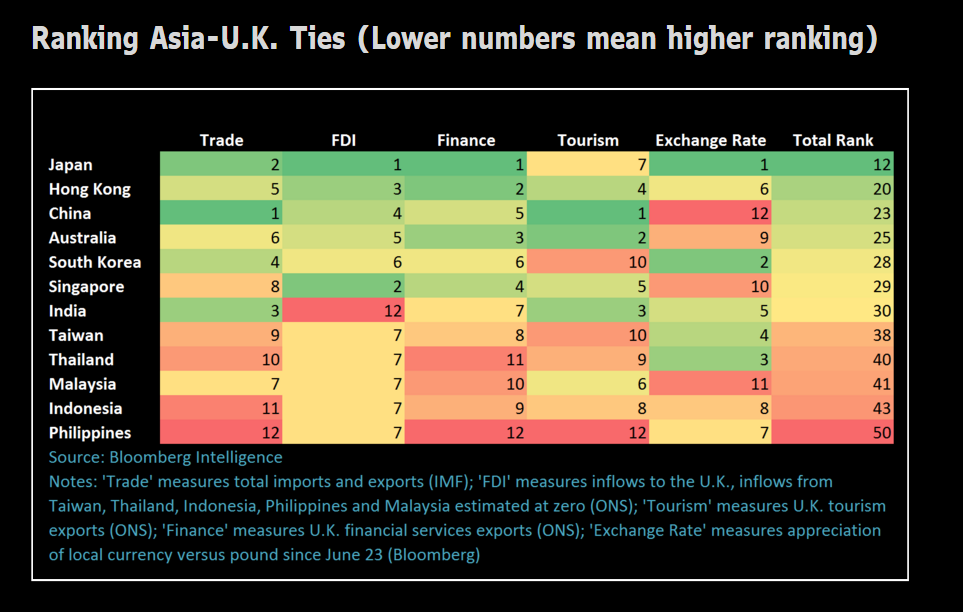 "Mentre la Brexit getta le relazioni del Regno Unito con l'Europa nella confusione, rafforzare i legami con le economie asiatiche che sono i principali motori della crescita globale è raramente stato così importante," scrivono Chen e Orlik in una nota. Gli analisti di Bloomberg intelligence elencano cinque fattori per misurare la forza delle relazioni bilaterali.