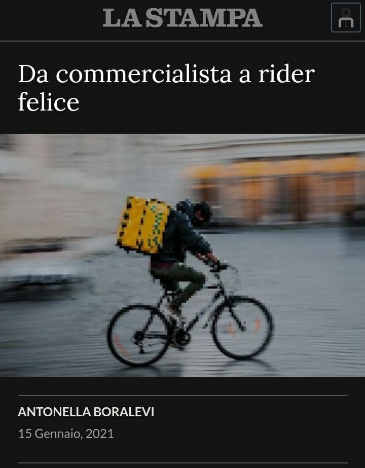 Sta facendo molto discutere un articolo pubblicato da La Stampa, firmato da Antonella Boralevi, in cui viene raccontata la storia di un 35enne, tale Emiliano Zappalà, che si è reinventato come rider quando il coronavirus lo ha costretto a chiudere il suo studio da commercialista. Secondo l’articolo, il protagonista della storia pedalerebbe con la sua bicicletta per 100 km al giorno consegnando per Deliveroo e guadagnerebbe dai 2000 ai 4000 euro netti. L’articolo conclude dicendo che sta risparmiando per comprare casa e con la domanda retorica “È un fatto. O no?”.