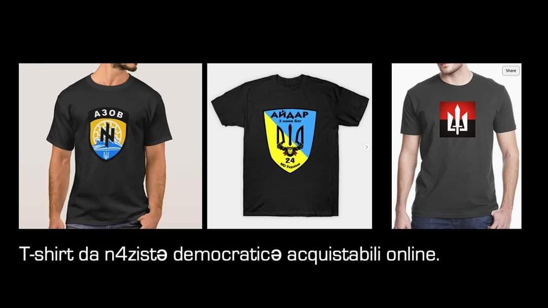 Da sinistra a destra, le t-shirt dei nazisti buoni di Azov, Aidar e Pravy Sektor acquistabili online.