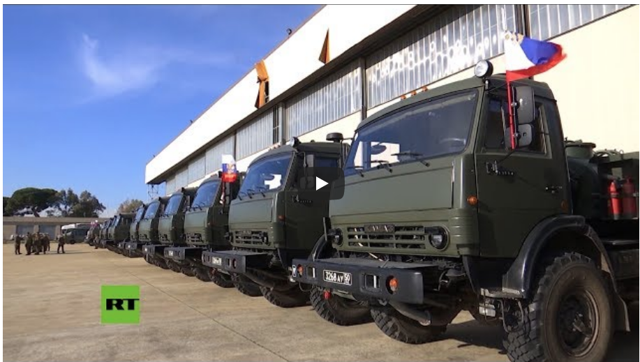 Un convoglio con squadre speciali ed esperti militari russi è partito dalla base dell'aeronautica militare italiana a Pratica di Mare, situata a 30 chilometri a sud-ovest di Roma, verso la città di Bergamo.