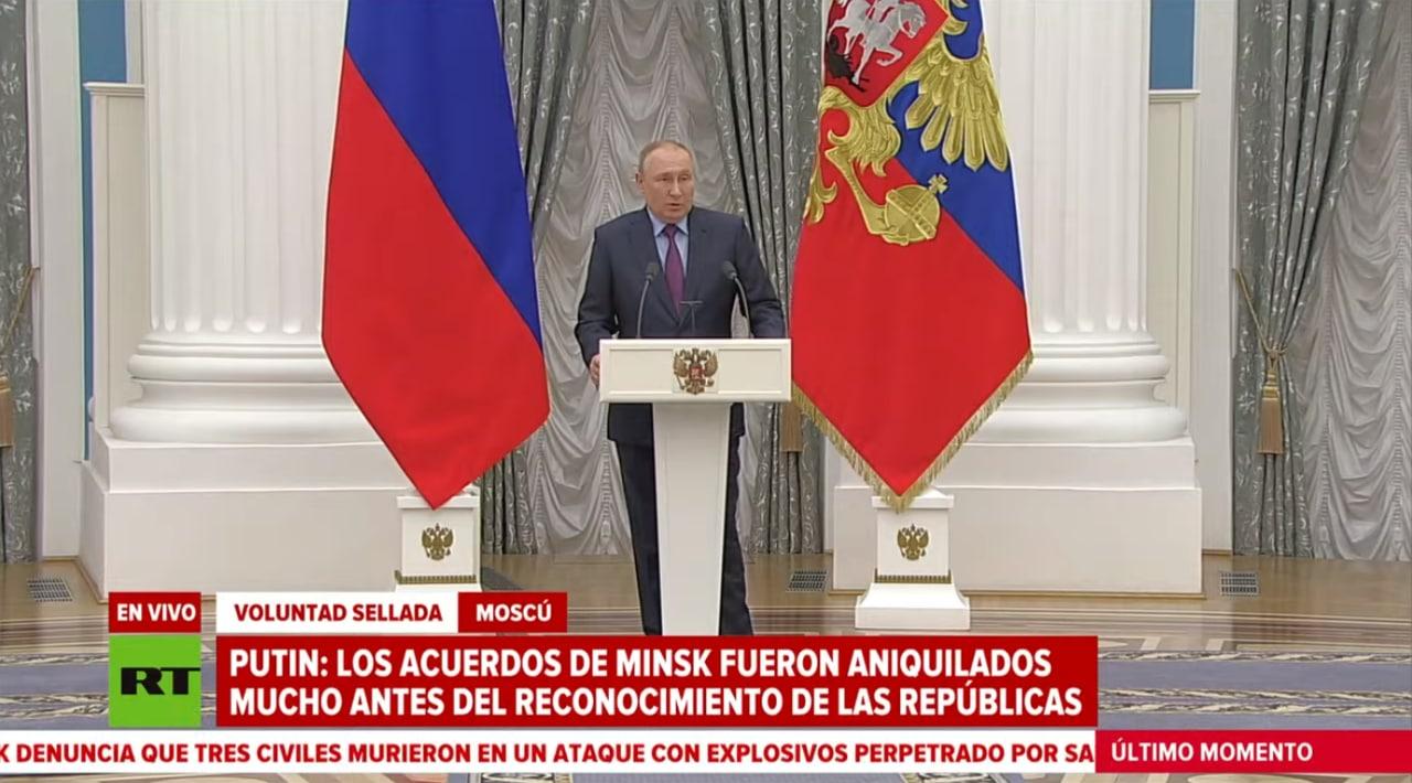 "La decisione di ieri di riconoscere le repubbliche popolari di Donetsk e Lugansk è in parte dovuta al rifiuto dell'Ucraina dell'applicazione degli accordi di Minsk", ha precisato Putin.