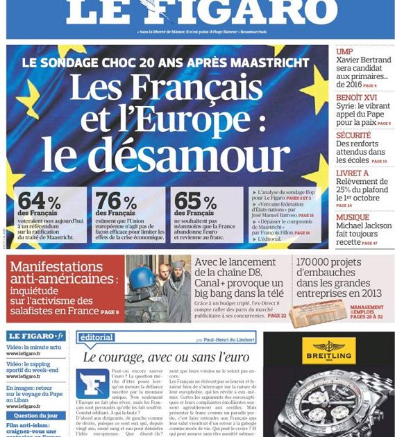 Vent'anni dopo la ratifica del trattato di Maastricht, due francesi su tre (il 64%) si dichiarano contrari al trattato che prevede la moneta unica. A sostenere tale tesi un sondaggio pubblicato da le Figaro, il quotidiano che titola su tutta la prima pagina "I francesi e l'Europa: il disamore". Il 20 settembre 1992, il trattato fu adottato con il 51% di favorevoli contro il 49% di contrari, ma oggi avrebbe il sostegno soltanto del 36%. Ed il 67% dice che l'Unione europea va "piuttosto nella direzione sbagliata" dalla ratificazione di Maastricht. Nel 1999, ricorda Le Figaro, il 53% - una maggioranza, sia pure risicata - riteneva che l'Ue andava "piuttosto nella buona direzione".