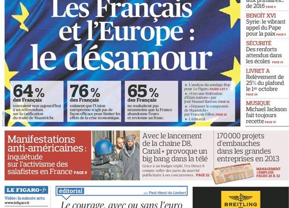 Il quotidiano francese manda un pessimo segnale Bruxelles, a François Hollande e a tutti gli europeisti. «La Francia sembra avere optato in modo duraturo per un atteggiamento euroscettico ed i francesi non sembrano più credere all'integrazione europea, che era stata presentata loro come lo scudo che li avrebbe protetti" dalle tempeste. Il crescente rifiuto nei confronti del progetto federale europeo si registra proprio nel momento in cui è necessario fare un importante passo verso l'Europa, "su domanda di Angela Merkel e soprattutto per confermare gli impegni presi dalla Banca centrale europea".