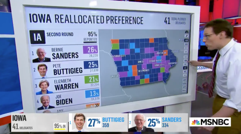 Non è tutto: oltre ai ritardi, agli smussamenti a piacimento del sistema elettorale stabilito dal Partito Democratico , ci sono anche degli “errori” (e cioè dei veri e propri brogli): qui vengono pubblicati gli errori rilevati nell’assegnazione delegati, tutti a sfavore di Sanders, per un totale di 14 delegati in meno, i quali gli permetterebbero di vincere definitivamente le primarie. Per aumentare la confusione, il presidente del Partito Democratico ha chiesto il riconteggio dei voti. I media, d’altro canto, hanno dato ampio spazio alla presunta vittoria di Pete Buttigieg ancora prima che ci fossero dei risultati attendibili. Egli stesso si è annunciato vincitore dopo che solo l’1.87% dei voti erano stati pubblicati!