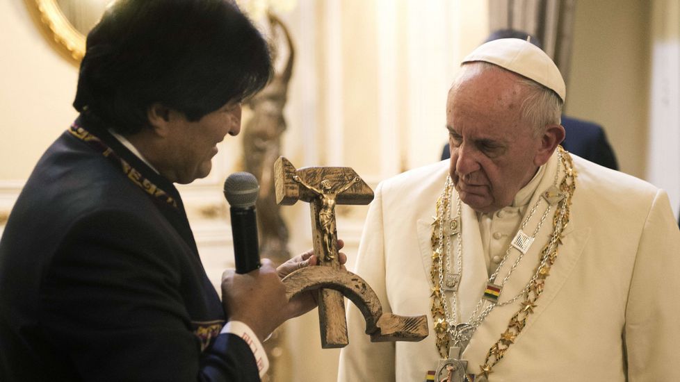 Il presidente della Bolivia, Evo Morales, ha regalato, questo mercoledì, a Papa Francesco un crocifisso con la falce e il martello durante il suo tour del Palazzo del Governo nella città di La Paz, dove il Pontefice ha salutato i ministri del paese andino.
