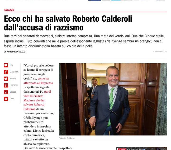Ben 81 parlamentari del PD, quasi tutti, votarono per salvare Calderoli che poi ricambiò il favore ritirando molti suoi emendamenti su leggi del governo. Questo schifo dimostra che viene dal palazzo la tolleranza contro il razzismo. Dare della scimmia ad un altro essere umano è l'atto abbietto e violento di un razzista che colpisce tutta la nostra umanità.