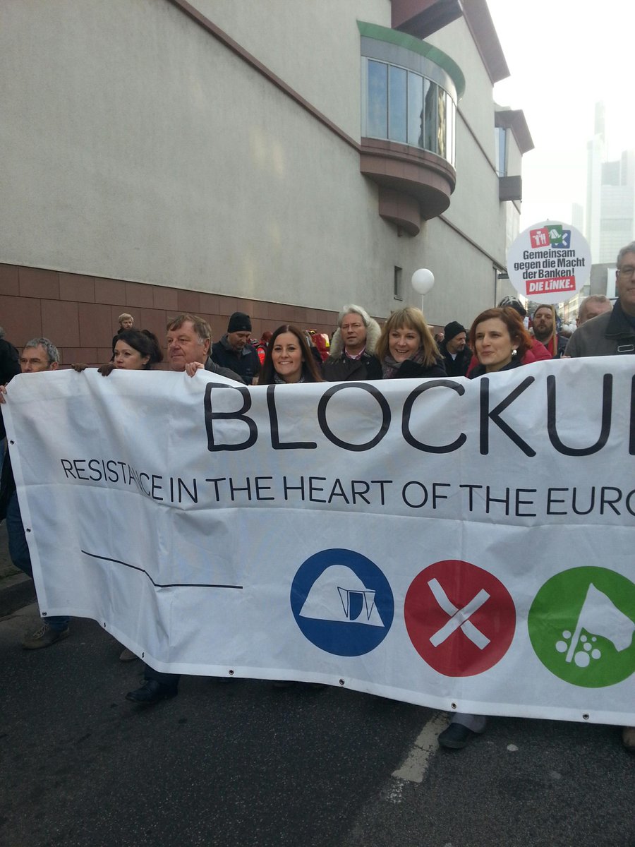 Migliaia di attivisti di Blockupy si sono riuniti nel centro della città e hanno marciato verso l'obiettivo della loro protesta, la nuova sede della BCE, che sarà inaugurata il prossimo marzo. Blockupy è una rete di organizzazioni europee di sinistra che protestano contro le riforme economiche imposte da Bruxelles. "Mentre i nostri colleghi, amici e compagni dell'Europa meridionale continuano a ribellarsi contro le politiche di impoverimento dettate dalla troika, la BCE si sposta nel suo nuovo palazzo", si legge sul sito di Blockupy.