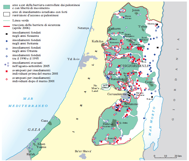 Nella guerra dei 6 Giorni del 1967, Israele aveva occupato tutta la Minipalestina che una squilibrata assemblea generale dell’ONU aveva strappato ai conquistadores sionisti. 26 anni dopo, gli Accordi di Oslo. La Minipalestina occupata e già frastagliata in isolotti incomunicanti da una proliferazione di insediamenti dichiarati illegali dall’ONU, è ulteriormente frantumata in tre aree ad amministrazioni distinte. Ne parliamo dopo.