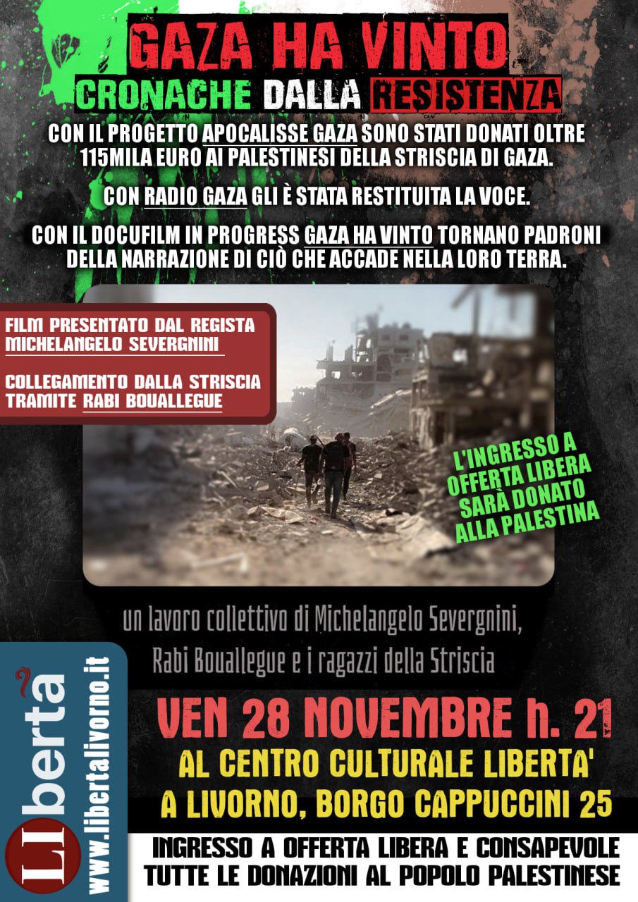 Venerdì 28 novembre "Gaza ha vinto" sarà proiettato a Livorno alle ore 21 presso il Centro Culturale Libertà in via Borgo Cappuccini 25. ?ngresso a offerta libera e consapevole.
