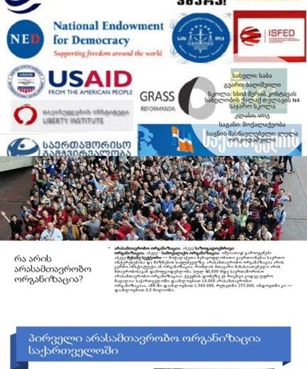 “Fondazione Soros”, USA, attiva ufficialmente in Georgia dagli anni '90 con nomi diversi. NED Fondo nazionale per la democrazia, USA, finanziatrice in particolare dell’ONG Aleko Elisashvili. EED, European Endowment for Democracy. L’IRI, International Republican Institute". L’NDI, "National-Democratic Institute" .