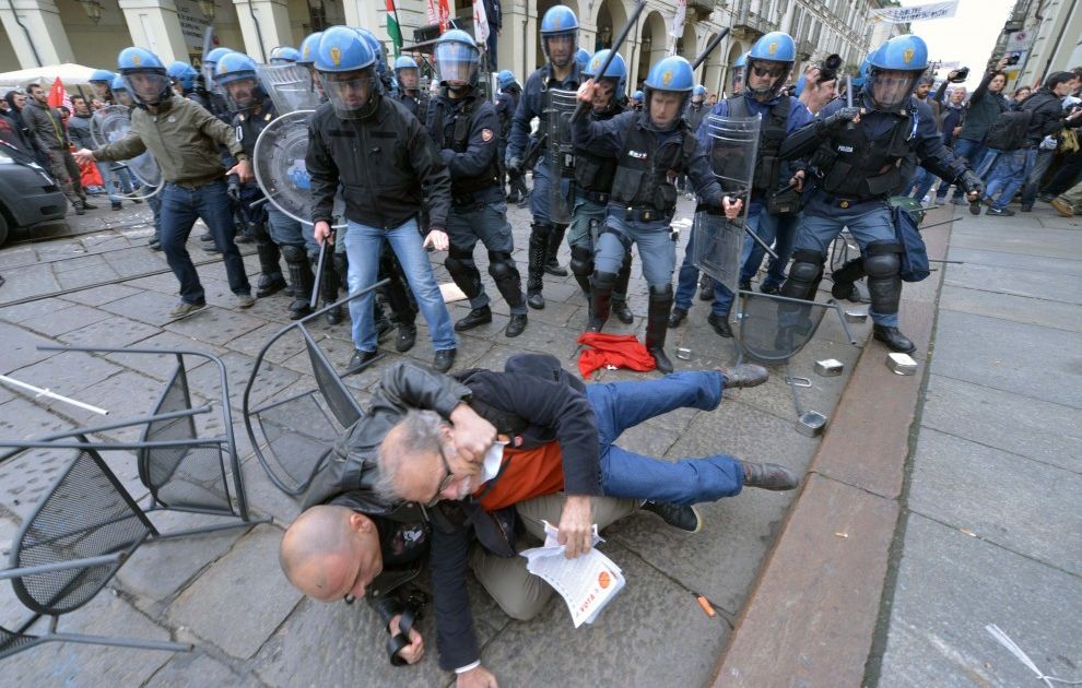 II 25 aprile, in occasione del corteo per la Liberazione a Torino, il servizio d'ordine del PD si confonde con le forze dell'ordine contro No Tav e Movimenti.