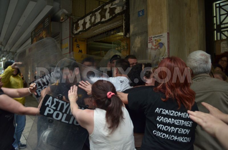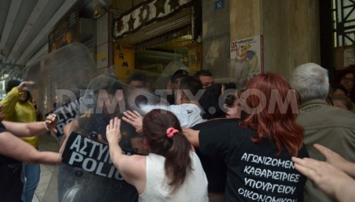 Il personale delle pulizie ad Atene ha ostruito l’ingresso del Ministero delle Finanze. La polizia in assetto antisommossa ha tentato di respingere l’assalto dei licenziati, ma è stato difficile trattenerli.