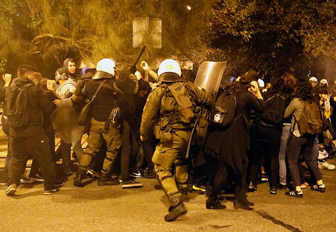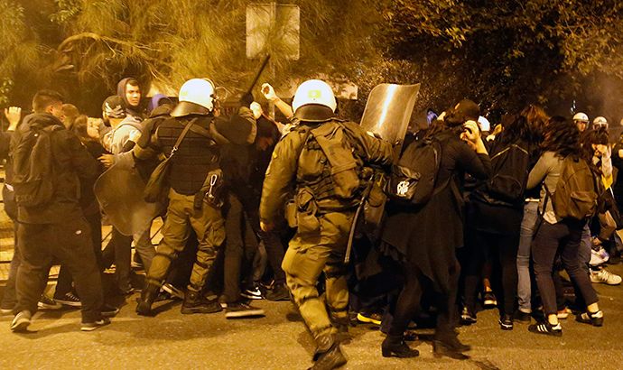 Gli scontri sono venuti subito dopo che 40.000 studenti, lavoratori e pensionati hanno marciato dal Parlamento in direzione dell’ambasciata degli Stati Uniti. I manifestanti - che accusano gli Stati Uniti di aver sostenuto la dittatura militare del 1967-1974 - gridavano "UE, FMI fuori!" mentre marciavano.