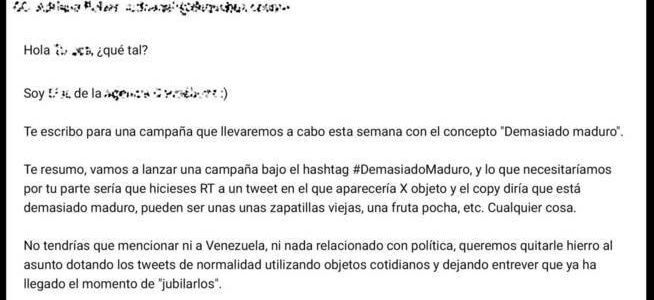 “Ciò di cui avremmo bisogno da parte tua sarebbe che tu facessi un tweet in cui dovrebbe apparire un vecchio oggetto – vecchie scarpe, un frutto marcio ecc – e l’autore del tweet dovrebbe affermare che è troppo maturo. Non dovresti parlare del Venezuela o di qualsiasi cosa legata alla politica, vogliamo mostrare la questione facendo normali tweet e usando oggetti di uso quotidiano e facendo sapere che è giunto il momento di ‘andare in pensione’“.