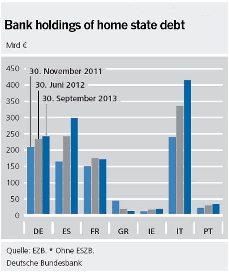 Dai dati delle banche italiane che hanno aumentato la loro partecipazione sui titoli obbligazionari del paese da 240 miliardi di euro del novembre 2011 a 415 miliardi di oggi – un incremento del 73% - di quelle spagnole che sono passati da 166 miliardi di euro a 299 miliardi (+81%), Ambrose Evans-Pritchard sostiene come l'impegno nel summit europeo del giugno 2012 per porre finire a questo pericoloso ed "incestuoso" legame non ha sortito alcun effetto.