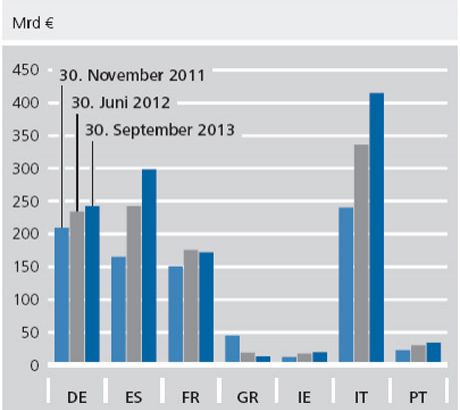 Ed il tutto non ha fatto altro che acuire il problema del debito: quello italiano è passato dal 119% al 133% del Pil dal 2010, e la media della maturità sta slittando per due anni con il Tesoro che confida sui titoli a breve coperti dalla Bce. Il debito spagnolo è aumentato dal 62% al 94%. Più a lungo le banche deterranno questi debiti, maggiore sarà il rischio. Il livello dei "bad loans" della Spagna, continua Evans-Pritchard citando i dati della Banca di Spagna del 18 novembre, hanno raggiunto il 12,68%, 188 miliardi di euro, il livello più alto nella storia. Il rapporto di Stabilità finanziario della Banca d'Italia ha dichiarato questo mese, inoltre, che le banche stanno affrontando un "rapido aumento nei prestiti non profittevoli, principalmente affari, come risultato della recessione prolungata" e le tensioni potrebbero riapparire nel 2014.