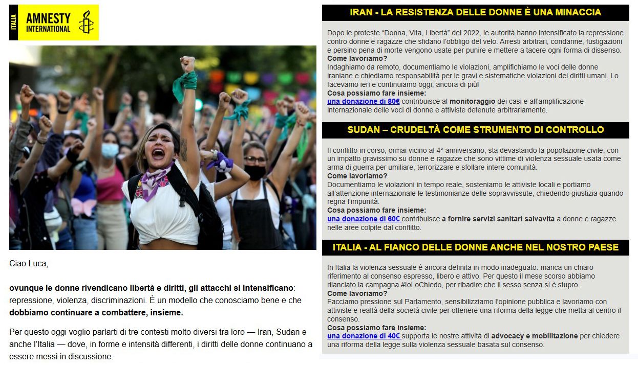 Tra queste, una spiccava su tutte le altre “... in occasione dell’8 marzo, Giornata Internazionale della Donna, noi di Amnesty International vogliamo ricordare che le pratiche autoritarie ledono i diritti e aumentano le disuguaglianze di genere e prosperano grazie al silenzio. Per contrastarle serve l’opposto: coraggio e un’azione collettiva che metta al centro libertà e dignità”. Un’iniziativa indiscutibilmente lodevole da assecondare senza se e senza ma!