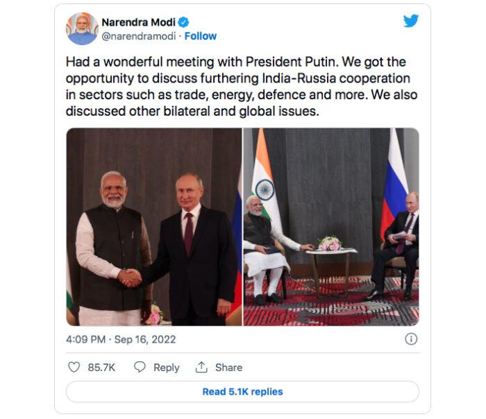 “Ho avuto un incontro meraviglioso con il presidente Putin. Abbiamo avuto modo di discutere su come promuovere la cooperazione India – Russia in settori come il commercio, l’energia, la difesa e altro. Abbiamo discusso anche di altre questioni bilaterali e globali”. Questo tweet, relativo all’incontro tra Vladimir Putin e Narendra Modi a Samarcanda (a margine del summit della Sco), si può leggere sull’account ufficiale del presidente indiano e colpisce non poco.