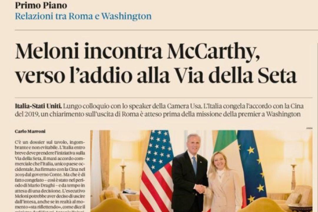 Il Sole 24 ore ci informa che il Governo Meloni, alla fine, dovrebbe abbondare il Memorandum sulla Via della Seta dopo un incontro tra la Premier e lo Speaker americano alla Camera.