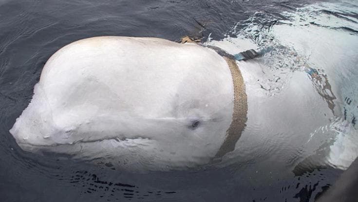 Saga cominciata nel 2019 quando una balenottera bianca, dall’aria simpatica, trovata davanti le coste norvegesi, campeggiò su tutti gli schermi TV e media mainstream mostrando sulla imbracatura una dicitura riportante una scritta a caratteri cirillici e un numero di telefono che, secondo anonimi “esperti” interpellati dai media mainstream, corrispondeva ad una struttura militare russa.