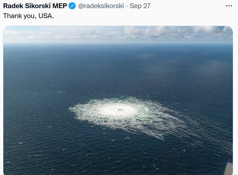 Il 26 settembre stesso, immediatamente e senza prima sapere cosa fosse successo (ci vollero un paio di giorni per avere la certezza che si fosse trattato di esplosioni), la premier Britannica Liz Truss ed il ministro degli esteri polacco Radoslav Sikorski, ringraziarono gli USA per l'accaduto. Il premier polacco Tusk, mettendoci il carico da undici, dichiarò: "A tutti gli iniziatori e ai sostenitori del Nord Stream 1 e 2. L'unica cosa che dovreste fare oggi è scusarvi e tacere".