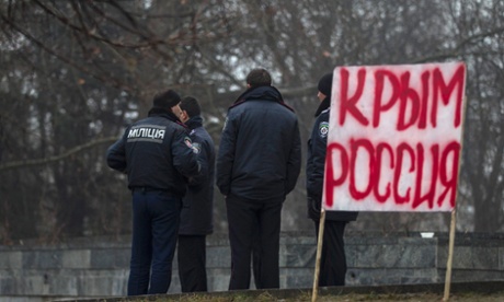 La polizia ucraina vicino a un manifesto in cui si legge "La Crimea è Russia"