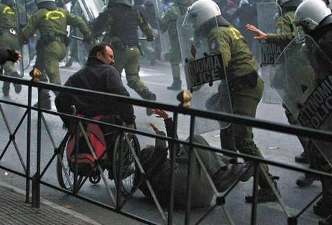 Nella giornata internazionale per le persone con disabilità, alcuni greci su sedia a rotelle si sono recati davanti al Ministro delle Finanze nel centro di Atene per protestare contro le misure d'austerità e i tagli ai sussidi medici di cui godevano. In un paese sotto commissariamento della Troika e in pieno collasso del Welfare State, può anche accadere che la polizia antisommossa pensi che queste persone possano occupare l'edificio e quindi proceda a questa reazione. “Passo oltre”, ha detto un ragazzo sulla sedia a rotella, “cosa vuoi farmi? Picchiarmi?”. Un uomo anziano ha oltrepassato il cordone di polizia gridando “lasciatemi passare”.