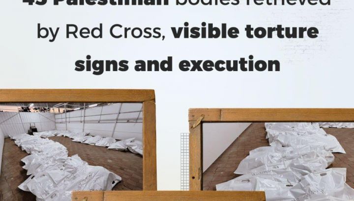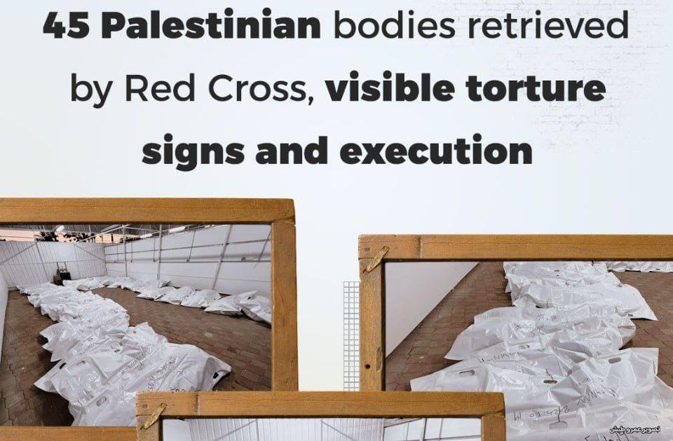 Le forze di occupazione israeliane hanno consegnato i corpi di 45 palestinesi al Comitato Internazionale della Croce Rossa. Secondo il Ministero della Salute palestinese, i corpi mostravano chiari segni di abusi brutali, tra cui tortura, mutilazione ed esecuzione sul campo. Molte vittime sono state trovate con le mani legate e gli occhi bendati.