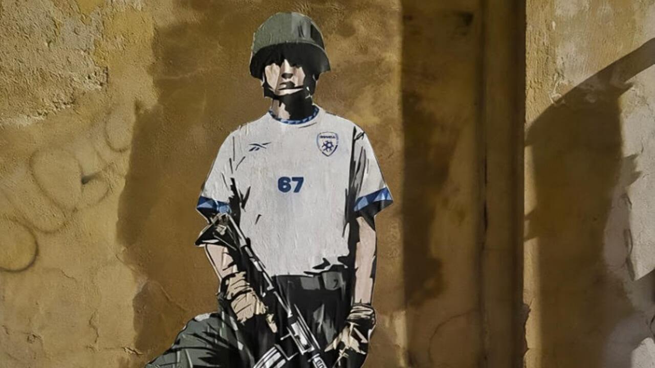Il calciatore ritratto con un fucile e un pallone sporco di sangue, ha la maglia numero 67, un riferimento ai 67mila palestinesi uccisi nel genocidio a Gaza.