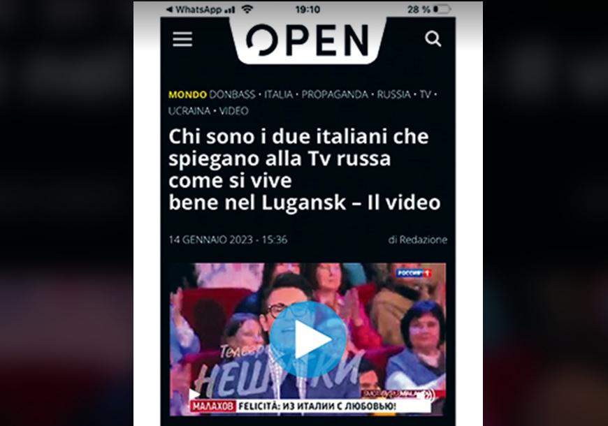 E’ possibile che tutte queste ipotesi sugli “attori” e gli scontorcimenti del pensiero siano la spia di quanto al canale “Ucraina Live” si sia bagnata la polvere nella fiaschetta, se le forze vengono spese per una bugia così primitiva? Ma tralasciamo di indovinarlo. Tuttavia, i giornalisti ucraini di Kiev a quanto pare hanno dei sostenitori in Italia. Fra loro per esempio l’autorevole sito “Open”, che si definisce un sito “anti fake news”, cioè per mezzo del “Fact Checking” stabilisce se una notizia è vera o falsa verificandone il contenuto. Ora, il fatto è che “Open” ha preso l’informazione pubblicata da “Ucraina Live” come vera, l’ha tradotta in italiano e l’ha condita con un pochetto di propria fantasia su Marinella Mondaini, cosa di cui la diretta interessata si è meravigliata molto. E così nel testo del sito Open una menzogna si sovrappone all’altra: Marinella è stata inserita tra gli oppositori alla vaccinazione contro il Covid e come giornalista avrebbe “spesso condotto attacchi contro i vaccini su “L’Antidiplomatico”. Del fatto che questa è un’insolente menzogna è facile sincerarsi leggendo i suoi articoli pubblicati sul suddetto sito. Non ha negato la presenza del virus, non ha mai detto o scritto nulla contro la vaccinazione. Ma la ciliegina sulla torta confezionata da Open, è la notizia, secondo cui Marinella prima viveva a Mosca, ma poi insieme a un altro italiano si è trasferita a Lugansk, “dove hanno iniziato una nuova vita”. In realtà Marinella l’italiano indicato l’ha visto per la prima volta nello studio televisivo di Malachov, e sebbene sia stata diverse volte nel Donbass, a Donec’zk, non è mai stata a Lugansk e inoltre vive tuttora a Mosca. Poi Open sprofonda in uno dei “cavalli di battaglia” più amati e usati da molti mass media italiani, asserendo che Marinella è impegnata nella diffusione della propaganda del Cremlino (e contro tale stereotipo, oramai divenuto di cemento armato, chi ha la forza di opporsi??) Quello che fa infuriare particolarmente gli smascheratori è una delle opere, scritte da Marinella, intitolata “Il Donbass vive e vivrà”, in cui l’autrice concorda (ma come ha osato??) con la “versione del Cremlino”, tanto che la regione dei minatori, il Donbass, è definita “indipendente da Kiev”.