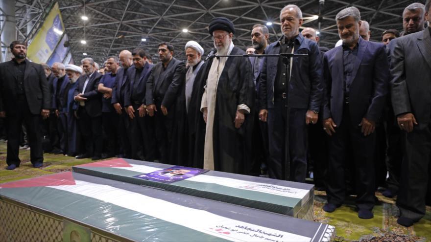 Nel cortile dell'Università di Teheran, Il leader della rivoluzione islamica iraniana l'ayatollah Seyed Ali Khamenei ha presieduto questo giovedì una preghiera davanti alle bare con i corpi di Haniya e della sua guardia del corpo Uasim Abu Shaaban, coperti con la bandiera palestinese, accompagnati da alti ufficiali militari iraniani e dalla Resistenza.