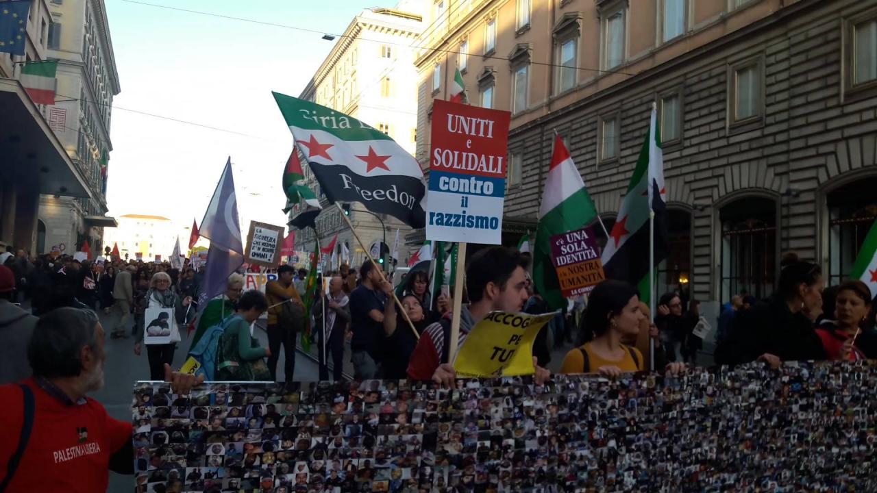 P.S. Nella foto di copertina, bandiere dei “ribelli siriani” che sventolano liberamente alla “manifestazione antirazzista” di Roma. Chi va per questi mari, questi pesci piglia.