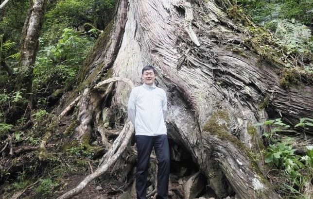 Guo Qinghua posa per una foto con l'albero più alto dell'Asia. (Foto fornita da Guo Qinghua)
