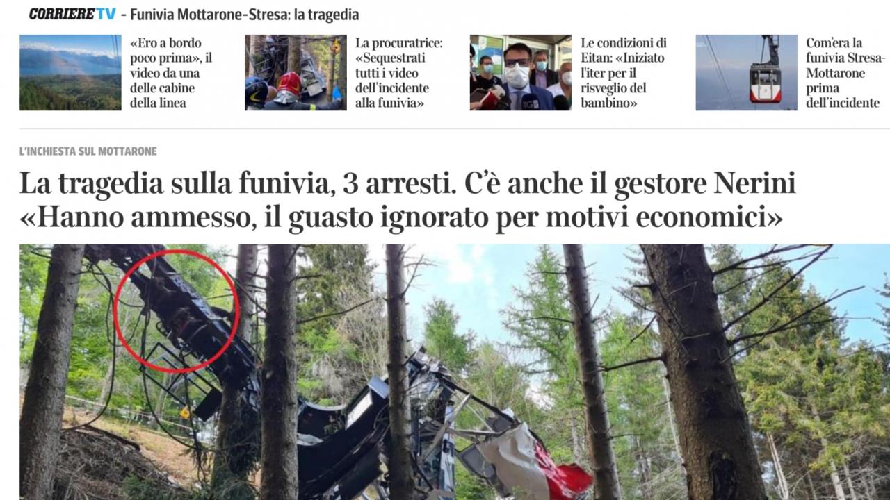 I vertici della società in appalto, ricordate questa parola, che gestiva la funivia dove sono morte quattordici persone, sono stati arrestati. Sapevano che l’impianto aveva dei problemi, ma invece che fermarlo e metterlo in sicurezza hanno deciso di farlo funzionare lo stesso, per non perdere la ripresa, per fare profitto, per contribuire al PIL.