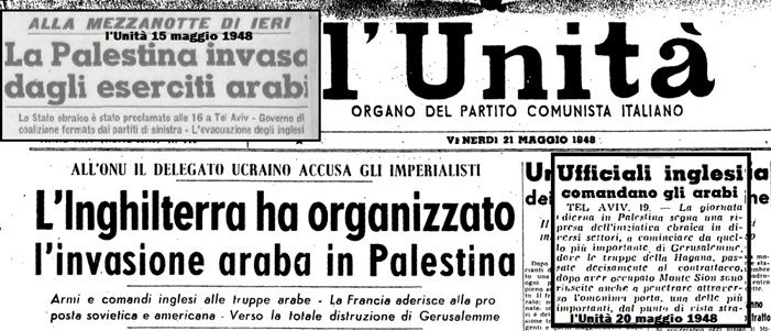 In questo susseguirsi di eventi storici è interessante vedere come la posizione della sinistra italiana e della sua “intellighenzia” sia cambiata nel tempo. Com’è noto oggi la questione palestinese ha compiuto il miracolo di riavvicinare la sinistra mainstream a quella antisistema o antimperialista. Le due parti si sono ricompattate nel condannare senza se e senza ma lo Stato ebraico fin dal 7 ottobre, il giorno dell’attacco terroristico di Hamas, ben prima che Israele iniziasse le operazioni militari a Gaza. Una condanna per così dire preventiva. Ma il 15 maggio 1948, subito dopo l’attacco arabo al nuovo Stato di Israele l’Unità titolava: “La Palestina invasa dagli eserciti arabi” Invasione, non liberazione. E questo è niente. Il 26 maggio 1948 sempre l’Unità scriveva:” Per la fine della guerra di aggressione. Interrogazione di Terracini al governo per il riconoscimento dello Stato d’Israele” e si chiedeva “…perché non abbiamo ancora provveduto al riconoscimento dello Stato d’Israele e se non ritengano di provvedervi senza ulteriore indugio, al fine di impedire che il silenzio e la passività della Repubblica italiana possano essere interpretati come approvazione della politica che ha stimolato e continua a sostenere la barbara guerra di aggressione che insanguina, tra l’orrore di tutto il mondo civile, la Palestina”. Aiutino per i lettori di oggi: con “barbara guerra di aggressione” si intendeva quella degli arabo-palestinesi contro Israele. Altri articoli mettevano in evidenza la lotta di “liberazione” intrapresa dall’Haganah, “l’organizzazione clandestina degli ebrei che lottano per la liberazione del paese dall’oppressione britannica”. Sembrerebbe che il Pci di allora non fosse strabico al tal punto da attribuire ad Israele la colpa di venire attaccato. Ma come mai il PCI e tutto il suo apparato d’intellighenzia era schierato compatto dalla parte di Israele e non con gli arabo-palestinesi?