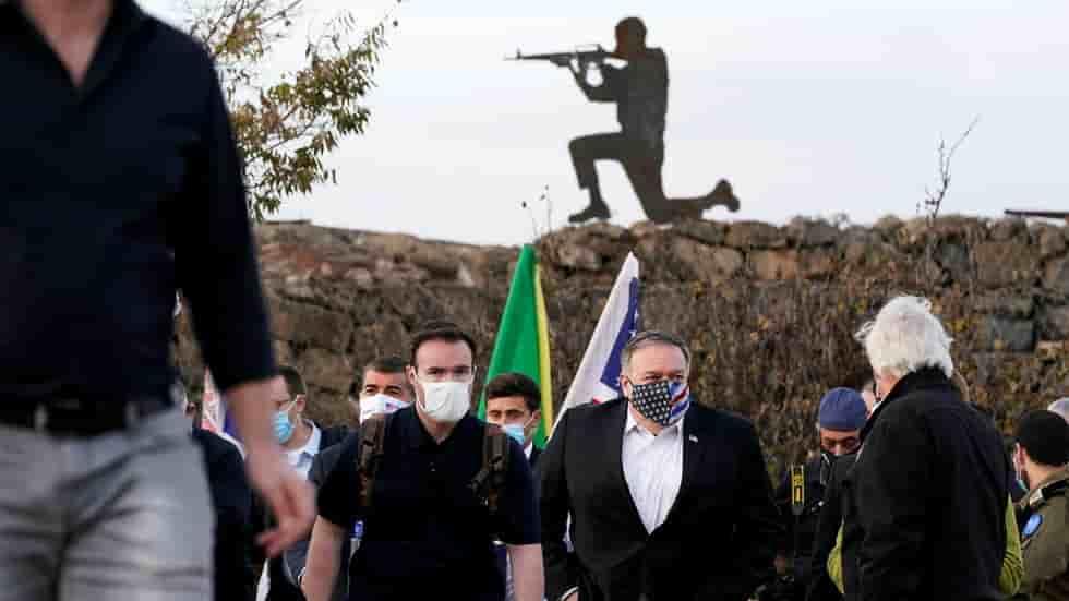 Pompeo è il primo esponenente di un'amministrazione statunitense a visitare l'area e la vicina Cisgiordania occupata da Israele, dove ha annunciato uno speciale sistema di etichette "made in Israel" per i prodotti della Cisgiordania. La mossa ha suscitato, tra l'altro, indignazione anche tra i palestinesi.