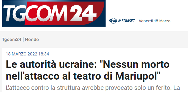 Delle due versioni, è importante ribadire come la stampa italiana filo Nato corra dietro alle false flag dei nazisti Azov che mirano a scatenare la terza guerra mondiale. Sul teatro di Mariupol anche la notizia delle "130 persone estratte vive" suscita perplessità vista la totale assenza di immagini dei sopravvissuti.