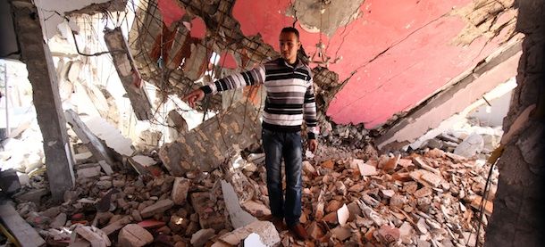 Mohammed al-Garari mostra le macerie della casa in cui viveva insieme alla sua e altre tre famiglie prima che venisse fatta saltare in aria da un attacco militare della NATO, lo scorso 19 giugno, a Tripoli.