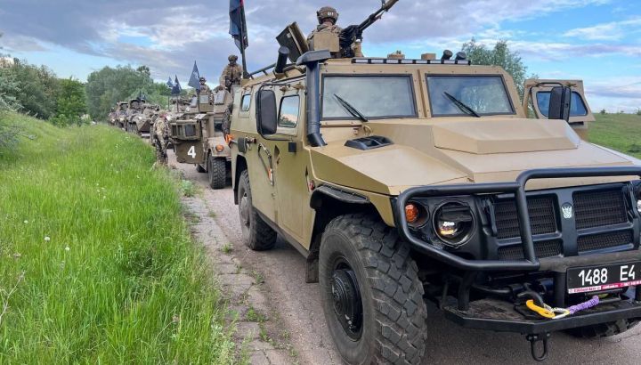 E, naturalmente, come tutti i fascisti, l'RVC ama i simboli. Ecco una colonna di veicoli militari dell'RVC. Si noti la targa — non è un caso che sia inquadrata. È il 1488, il simbolo numerico dei neonazisti. E, naturalmente, teschi, rune e cortei con le fiaccole — tutto il repertorio dell'estetica nazista — sono in voga.