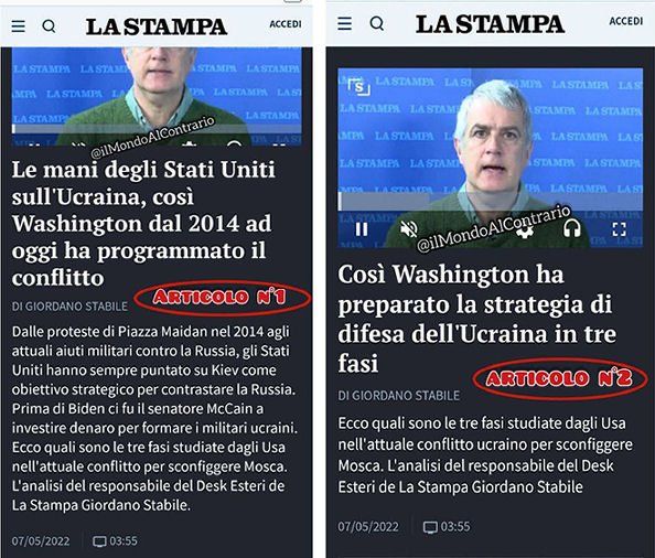 Un altro esempio clamoroso è stato rivelato ieri dal canale twitter @ilmondoalcontrario: lo scorso sabato La Stampa ha pubblicato un video intitolato: “Le mani degli Stati Uniti sull’Ucraina, così Washington dal 2014 ad oggi ha programmato il conflitto.” Nel sottotitolo si leggeva : “Dalle proteste di piazza Maidan nel 2014 agli attuali aiuti militari contro la Russia, gli Stati Uniti hanno sempre puntato su Kiev come obiettivo strategico per contrastare la Russia. Prima di Biden ci fu il senatore McCain a investire denaro per formare i militari ucraini. Ecco quali sono le tre fasi studiate dagli Usa nell’attuale conflitto per sconfiggere Mosca.”