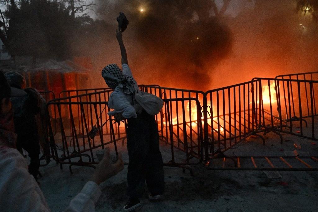 Le immagini provenienti da Città del Messico mostrano decine di manifestanti che lanciano oggetti incendiari, pietre e fumogeni contro gli agenti di polizia che sorvegliano la legazione diplomatica e gridano slogan contro Israele e la sua guerra genocida nella Striscia di Gaza.