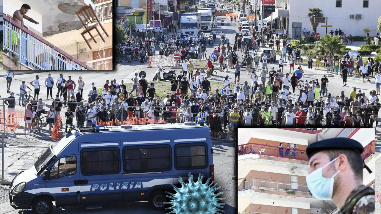 Mondragone: caccia agli untori, in questo caso lavoratori bulgari chiamati in Italia per la raccolta della frutta. Una storia cominciata non per qualche caso di COVID ma a seguito di un tampone rivelatosi positivo effettuato su una donna bulgara recatasi a partorire nel vicino ospedale di Sessa Aurunca. Viene così ordinata l’effettuazione di 582 tamponi (25 risultano positivi) nella comunità bulgara alloggiata in quattro edifici (della cosiddetta area Cirio) che vengono dichiarati “Zona Rossa” con confinamento in casa. Qualcuno, comprensibilmente, scappa dagli edifici (dove si alloggia fino a sei persone per stanza) e questo scatena una xenofoba rivolta tra gli italiani di Mondragone resi ipocondriaci da due mesi di lockdown. A peggiorare le cose, l’arrivo dell’Esercito (chiamato su sollecitazione del Governatore de Luca, che, certamente, consoliderà così il suo trionfo alle prossime elezioni regionali) e l’imminente comizio a Mondragone di Matteo Salvini.