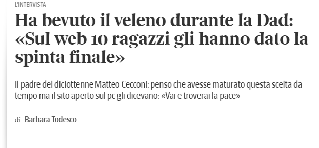 "La mattina del suicidio, racconta ancora Alessandro Cecconi ai giornali del bassanese, il figlio si era collegato al sito e gli altri 10 adolescenti connessi gli scrivevano «Vai e troverai la pace», «non temere vedrai che andrà tutto bene».